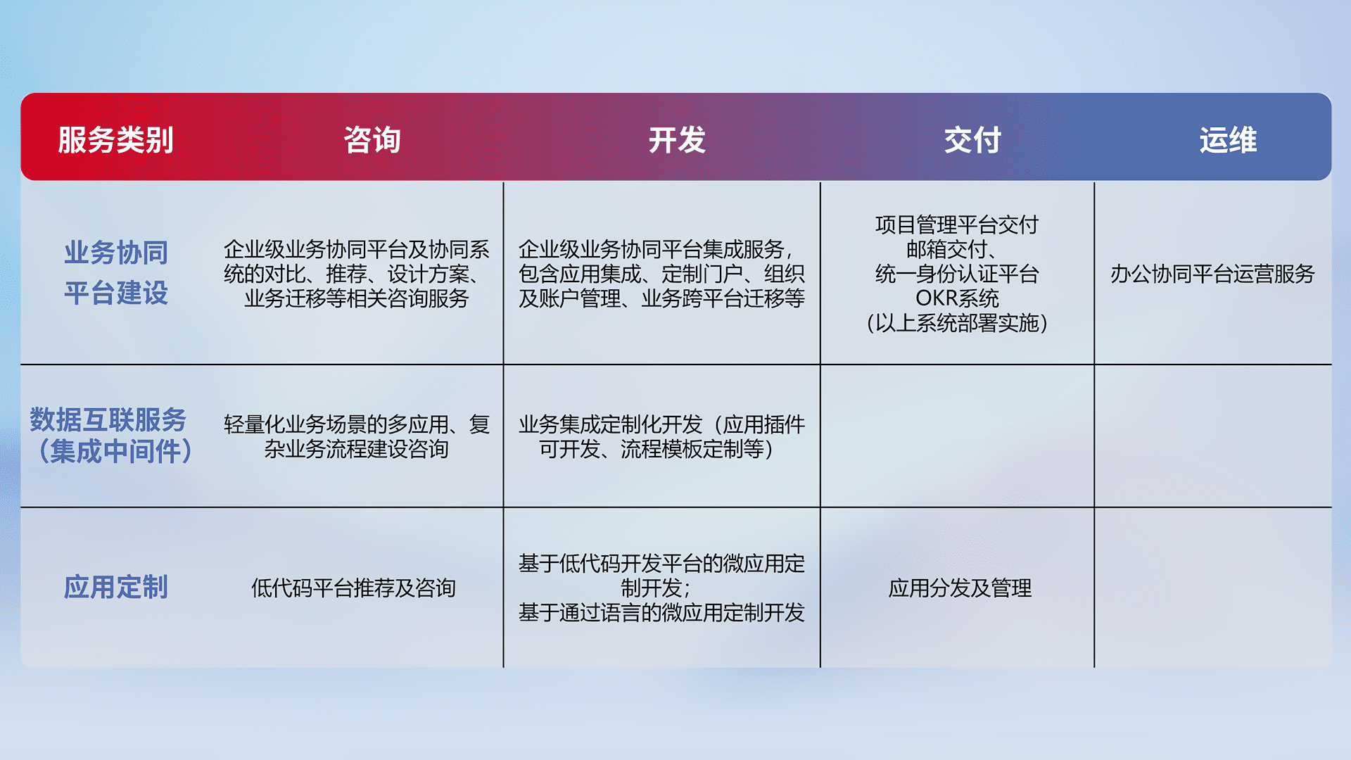 针对钉钉、、、企微、、IDaas等平台级产品提供产品的规划、、方案、、、、交付、、、定制化开发等服务,,实现如统一协同办公、、、、智能客户服务、、、、混合会议管理、、、智能数据查询、、、、等业务场景,,,实现数字化转型。。。。