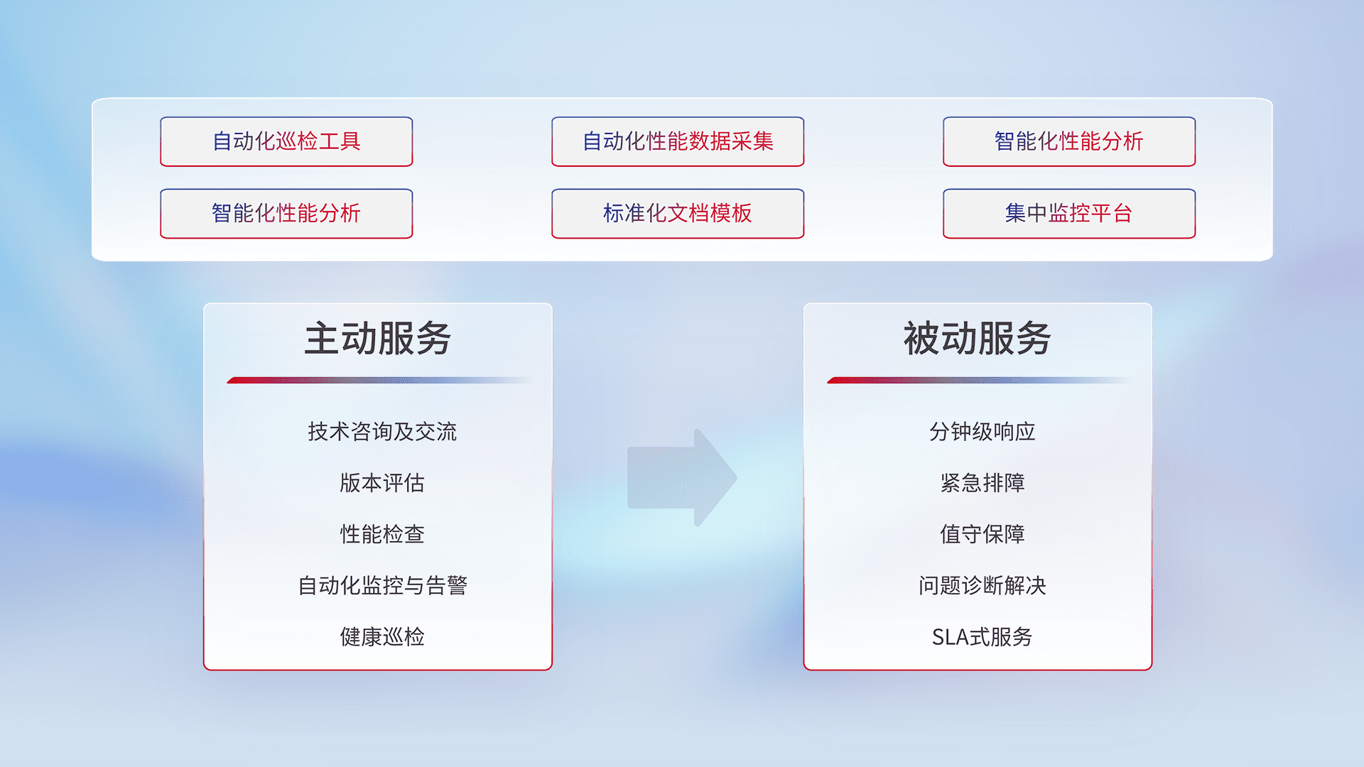智能化工具和标准化文档,,,保障服务质量,,,提供主动服务(包含技术咨询、、版本评估、、性能检查、、、、自动化监控与告警、、、、健康巡检)和被动服务包含(分钟级响应、、、紧急排障、、值守保障、、、问题诊断解决、、SLA服务)。。。